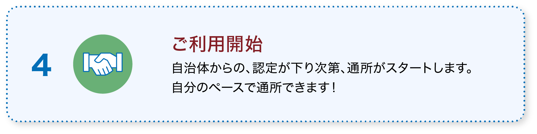 その他福祉サービスや相談支援員、医師の意見なども参考にしながら、皆様に合うペースで通所時間や日数を増やしていきましょう。