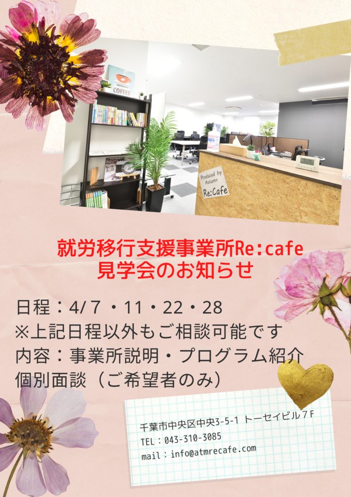 皆さん今月も就労移行支援事業所Re:cafeです🍀4月に入りましたが...日がたつのは早いですね(^^♪