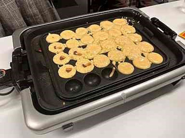 次は、生地をたこ焼きプレートに流し入れ、シーフード、ウインナー、チーズ等、色々とトッピングをして、焼き色が付くのを待ちます。