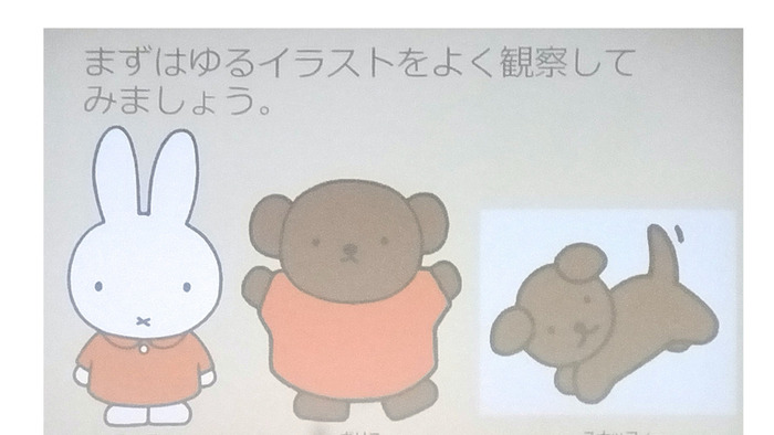 講座を行って頂いた方は、普段からイラストを描かれており、今回はその手順の説明から始めます。 手描きをしているのですが、とても上手ですよね。 ミッフィー、ボリス、スナッフィーのイラストを映して、手順を説明した後、皆様に描いて頂きました。
