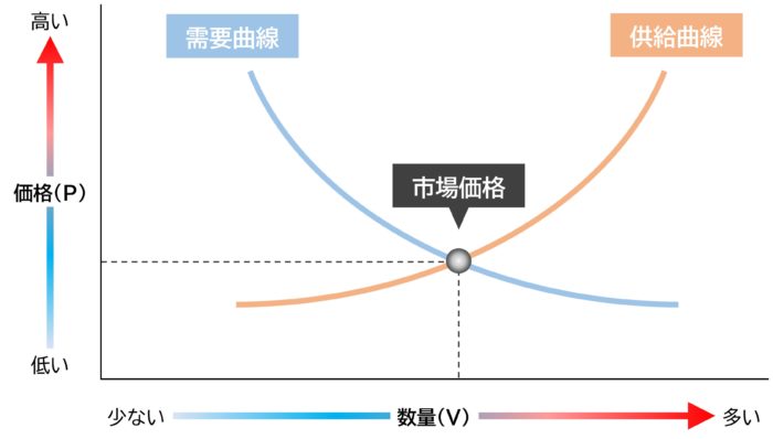 消費者は安ければ沢山買いたいと考え、高ければ買う量を減らします。一方供給業者においては高く売れるなら沢山作りたいと考え、安ければ作る量を減らします。