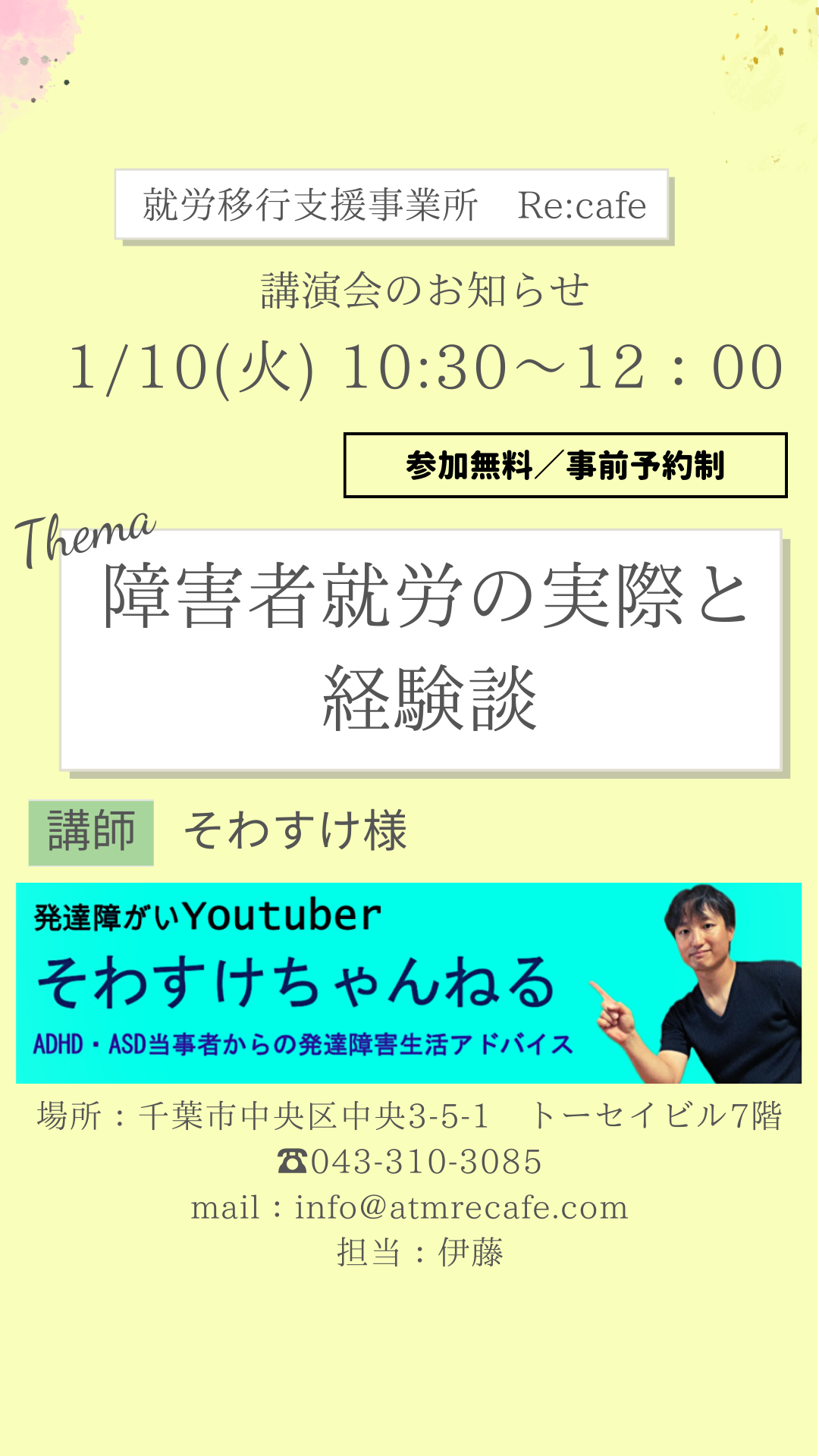 千葉市の就労移行支援事業所はRe:cafe 皆さんこんにちは★就労移行支援事業所Re:cafeです🍀新年あけましておめでとうございます。本年もよろしくお願いいたします。 さて!今年に入り、以前YouTubeで撮影をして頂 ...